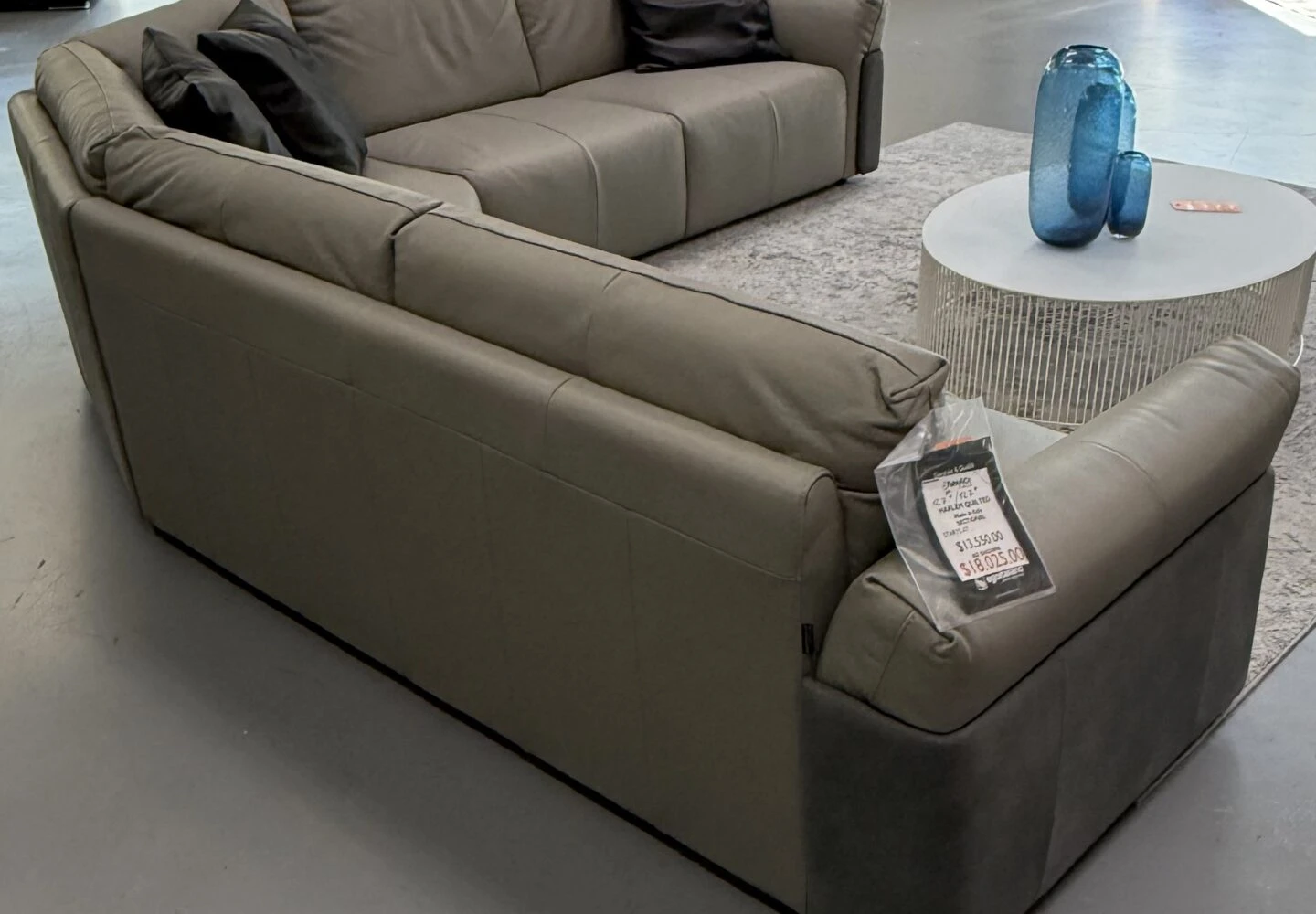 MFG: EGOTALIANO SIZE: 127Lx127Lx41Dx33H COVER: GRADE C FULL GRAIN THICK LEATHER 2.0/2.2 mm COLOR LIGHT GRAPHITE + SIDE PANEL NUBUCK DARK GRAPHITE MSRP $18,025